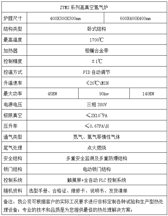 產(chǎn)品簡介:該設(shè)備ZYMS1700-90-64將真空/氣氛、高溫?zé)Y(jié)結(jié)合在一起,是我公司專門陶瓷金屬化霧化芯行業(yè)、晶圓加熱板行業(yè)研發(fā)的一款高真空氫氣燒結(jié)爐(可真空燒結(jié)也可通氫氣燒結(jié));該設(shè)備具有超高的溫場均勻度,多重的安全保護(hù)結(jié)構(gòu)、精準(zhǔn)的控制精度,合理結(jié)構(gòu)及控制系統(tǒng)設(shè)計(jì)可以讓生產(chǎn)更加安全高效,節(jié)省人力及工藝成本、提高生產(chǎn)效率;